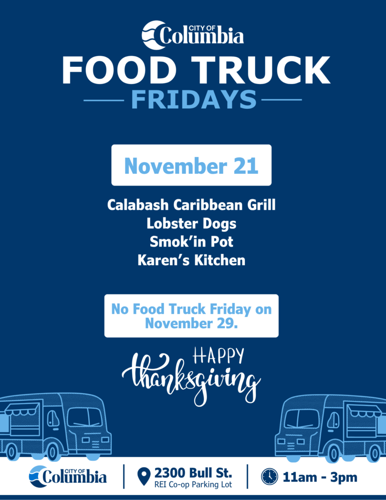 Food Truck Fridays are held every Friday from 11:00AM – 3:00PM at 2300 Bull Street (in the REI Co-op parking lot).  You will find in the flyer the list of all food truck vendors participating this month!