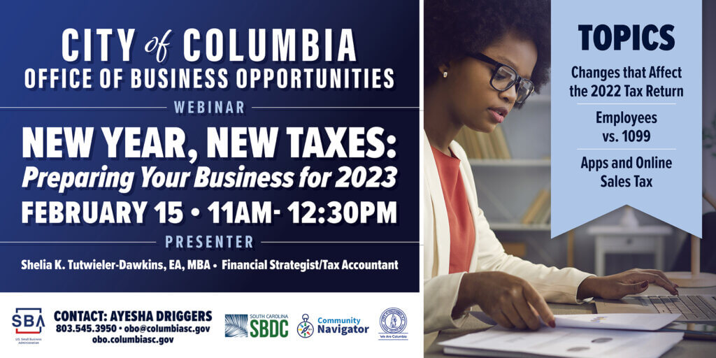 The City of Columbia’s Office of Business Opportunities will be hosting “New Year, New Taxes: Preparing Your Business for 2023” webinar on Wednesday, February 15th at 11:00AM. The featured presenter for this webinar, Shelia K. Tutwieler-Dawkins, Financial Strategist/Tax Accountant, will discuss topics relating to preparing small businesses for the 2023 income tax season! To register for this FREE webinar, go to OBO’s Eventbrite page!