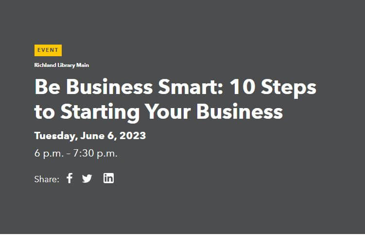 Richland Library will be hosting the Be Business Smart: 10 Steps to Starting Your Business in person event on Tuesday, June 6th beginning at 6:00PM.