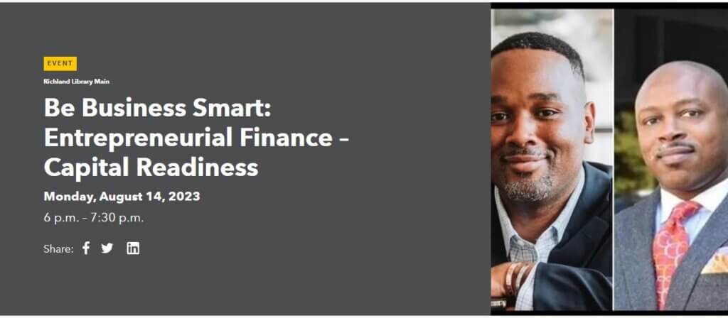 Richland Library will be hosting Be Business Smart: Entrepreneurial Finance – Capital Readiness on Monday, August 14th at 6:00PM.