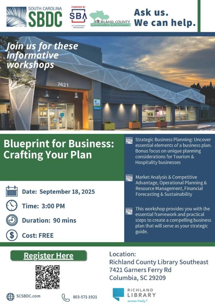 The South Carolina Small Business Development Center (SC SBDC) and the U.S. Small Business Administration (SBA) will be hosting workshops on September 18th beginning at 3:00PM at the Richland Library Southeast. Small business owners and entrepreneurs can participate for FREE and learn more on creating a business plan and market analysis! For more information and to register, click HERE!