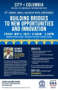 The City of Columbia’s Office of Business Opportunities will be hosting its 10th Annual Small Business Week Conference on Friday, May 5, 2023 at the Medallion Conference Center, 7309 Garners Ferry Road, Columbia, SC!