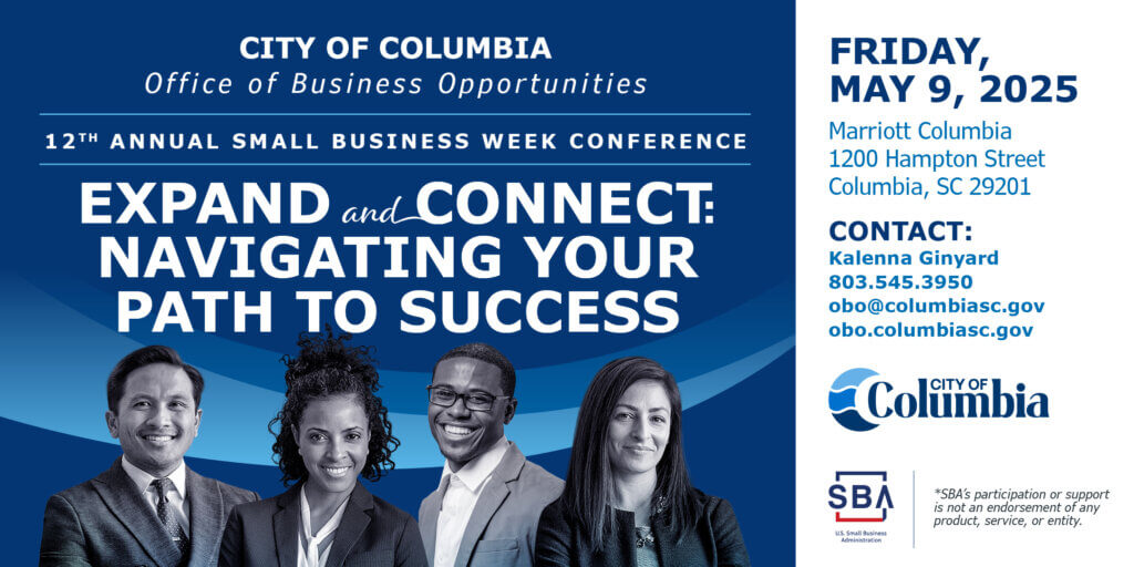 The City of Columbia’s Office of Business Opportunities will be hosting the City of Columbia’s 12th Annual Small Business Week Conference on Friday, May 9, 2025 at the Marriott Columbia, 1200 Hampton Street, Columbia, SC 29201. During this conference, we will have breakout sessions, keynote speakers, and more.