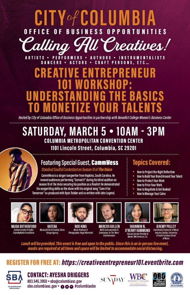 Join us to learn the tools you need to move your creative talents forward! The City of Columbia’s Office of Business Opportunities in partnership with Benedict College Women’s Business Center is excited to announce the Creative Entrepreneur 101 Workshop: Understanding the Basics to Monetize Your Talents! Participants will receive tools and resources to get started on their path to becoming a creative entrepreneur! Guest speakers include: Naida Rutherford, Katera, Rod King, Marcus Gullen, Shannon N. O’Berry Hammond, and Jeremy Polley. Also, special guest for this event, South Carolina native and finalist from NBC’s The Voice CammWess!