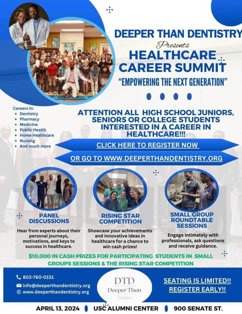 The Deeper Than Dentistry’s Healthcare Career Summit: Empowering the Next Generation will take place on Saturday, April 13th at the USC Alumni Center, 900 Senate Street, Columbia, SC 29201.