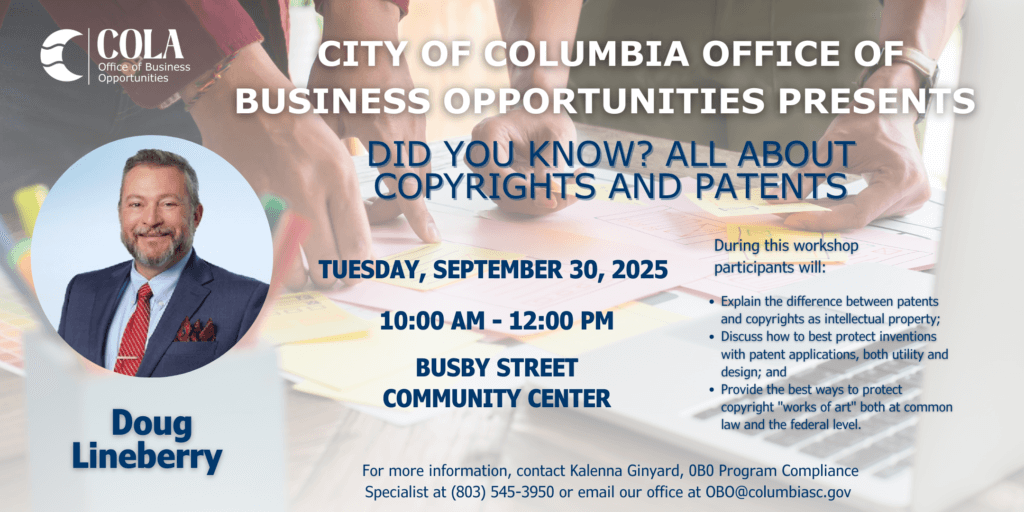 The City of Columbia’s Office of Business Opportunities will be hosting the Did You Know? All About Copyrights and Patents workshop on Tuesday, September 30th beginning at 10:00AM at the Busby Street Community Center!