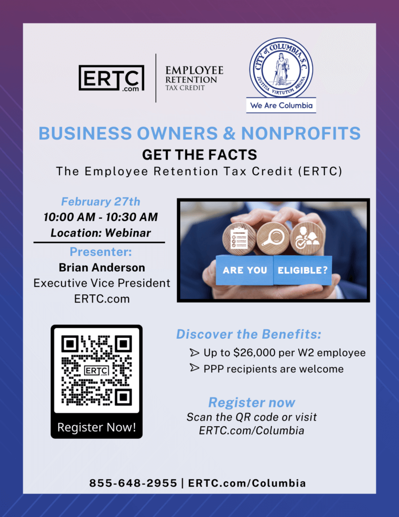 The City of Columbia is partnering with the Employee Retention Tax Credit (ERTC) on Tuesday, February 27th to host a webinar on learning more information on the Employee Retention Tax Credit (ERTC). For more information and to register, click here to go to the ERTC website or contact ERTC at (855)648-2955!
