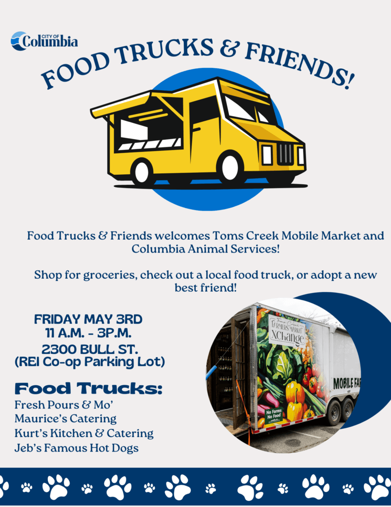 In addition to food trucks, Toms Creek Mobile Market and Columbia Animal Services will be participating. Shop for groceries, check out a local food truck, or adopt a new best friend!