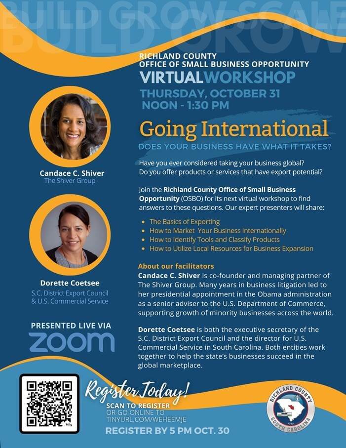 The Richland County Office of Small Business Opportunity (OSBO) will be hosting the Going International: Does Your Business Have What It Takes? webinar on Thursday, October 31st beginning at 12:00PM.