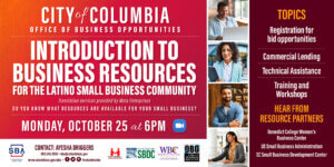 The City of Columbia’s Office of Business Opportunities will be presenting a webinar on Monday, October 25th for our Latino Small Business Community! The Introduction to Business Resources webinar will cover topics such as registering in the City of Columbia’s eBid, commercial lending, technical assistance, training, and workshops! You will also hear from our resource partners Benedict College Women’s Business Center, U.S. Small Business Administration and the SC Small Business Development Center! For more information and to register for free, go to our Eventbrite page!