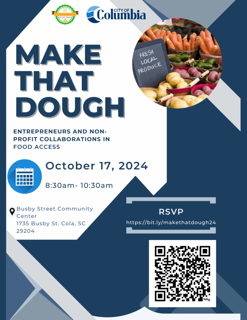 The Columbia Food Policy Committee will be hosting the Make That Dough event for entrepreneurs and non-profit organizations on Thursday, October 17th beginning at 8:30AM at the Busby Street Community Center, 1735 Busby Street, Columbia, SC 29203.