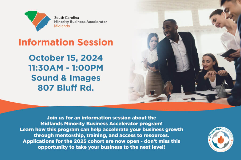The Midlands Minority Business Accelerator program will host an information session to learn how this program can help accelerate your business growth through mentorship, training, and access to resources. For more information and to register, click here to go to the Columbia Chamber of Commerce webpage!