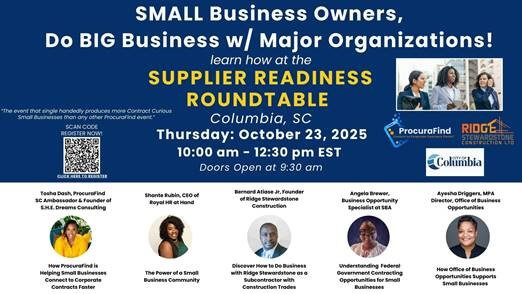 ProcuraFind in partnership with Ridge Steward Stone Construction and the City of Columbia’s Office of Business Opportunities will be hosting the Supplier Readiness Roundtable on Thursday, October 23rd beginning at 10:00A.M.  The event will take place at the Busby Street, Community Center, 1735 Busby Street, Columbia, SC 29203.