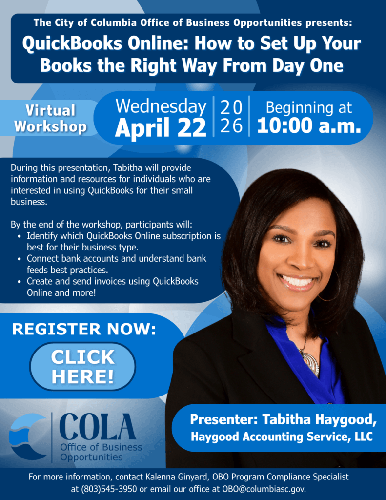 The City of Columbia’s Office of Business Opportunities will be hosting QuickBooks Online: How to Set Up Your Books the Right Way From Day One on Wednesday, April 22nd beginning at 10:00AM!