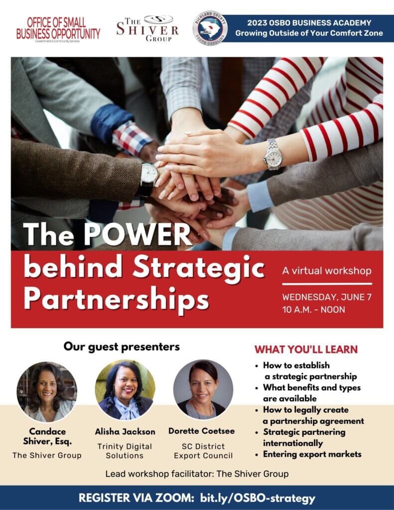 Join Richland County’s Office of Small Business Opportunity on Wednesday, June 7th for their virtual workshop The Power Behind Strategic Partnerships.  Participants will hear from guest presenters on how they can establish strategic partnerships and what are the benefits from them.  For more information, contact Richland County Office of Small Business Opportunity at (803)576-1540 or send an email to osbo@richlandcountysc.gov!