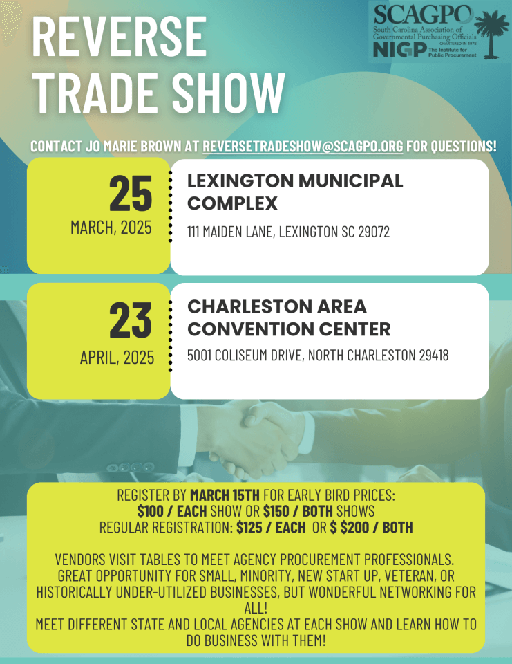 The South Carolina Association of Government Purchasing Officials (SCAGPO) will be hosting their Reverse Trade Show in Lexington and North Charleston, SC in March and April!