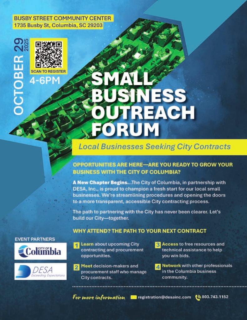 The City of Columbia and DESA, Inc. will be hosting the Small Business Outreach Forum on Wednesday, October 29th beginning at 4:00PM at the Busby Street Community Center. This is a great opportunity for small businesses who are seeking procurement opportunities with the City of Columbia to attend and be informed on upcoming City procurements and more!