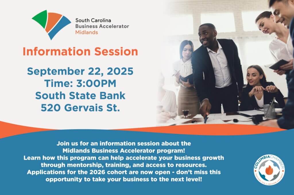 The Columbia Chamber of Commerce will be hosting the Midlands Business Accelerator Information Session on Monday, September 22nd at 3:00PM at South State Bank, 520 Gervais Street.