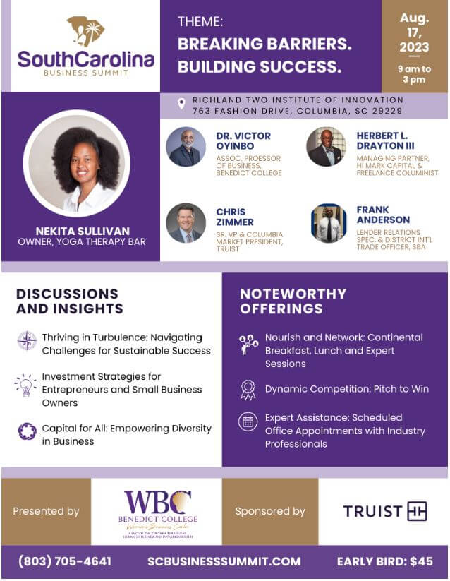 The Benedict College Women’s Business Center presents the South Carolina Business Summit on Thursday, August 17th from 9:00AM – 3:00PM.  The South Carolina Business Summit aims to provide a platform for entrepreneurs, professionals, and business owners to come together and exchange ideas,, insights, and strategies to overcome obstacles and achieve success in today’s competitive business landscape.  By focusing on breaking barriers, the South Carolina Business Summit seeks to empower individuals and organizations to overcome challenges and reach new heights.