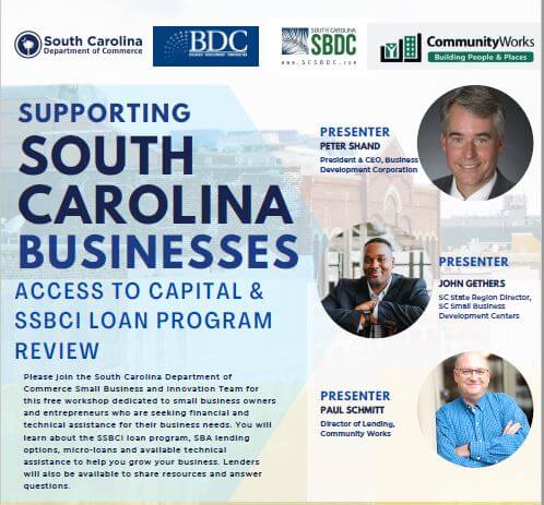 The South Carolina Department of Commerce, Business Development Corporation, South Carolina Small Business Development Center (SBDC), and CommunityWorks will be hosting the Supporting South Carolina Businesses Access to Capital & SSBCI Loan Program Review workshop on Wednesday, May 24th beginning at 9:30AM. During this free workshop, participants will be hearing from representatives of Business Development Corporation, CommunityWorks, and the SC Small Business Development Center and will learn about the SSBCI loan program, SBA lending options, micro-loans, and available technical assistance. For more information, contact the South Carolina Department of Commerce at (803)603-0614 or send an email to SmallBizSupport@sccommerce.com! To register for this event, click here to be directed to the registration page!