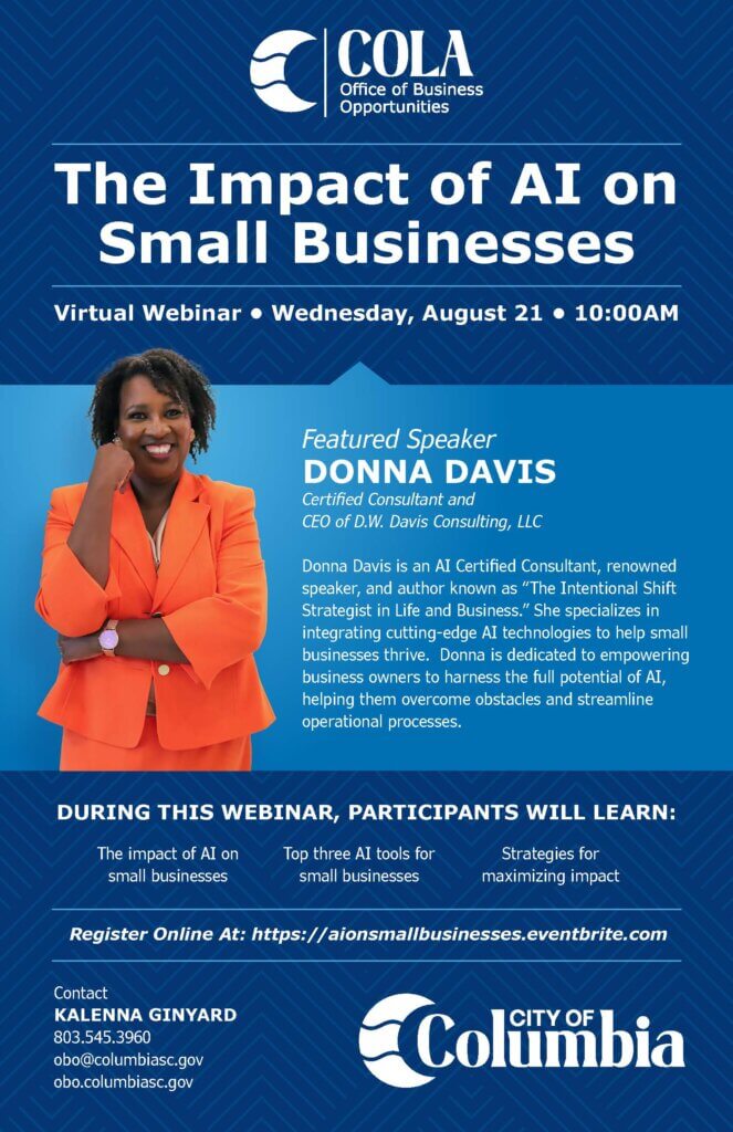 Join us and our featured presenter, Donna Davis of DW Davis Consulting, LLC as we dive into the discussion of artificial intelligence (AI) and how it will impact small businesses!