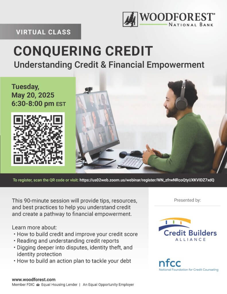 Woodforest Bank will be presenting a virtual class on Tuesday, May 20th entitled Conquering Credit: Understanding Credit & Financial Empowerment.  This course will provide tips, resources and best practices to help you understand credit and create a pathway to financial empowerment.